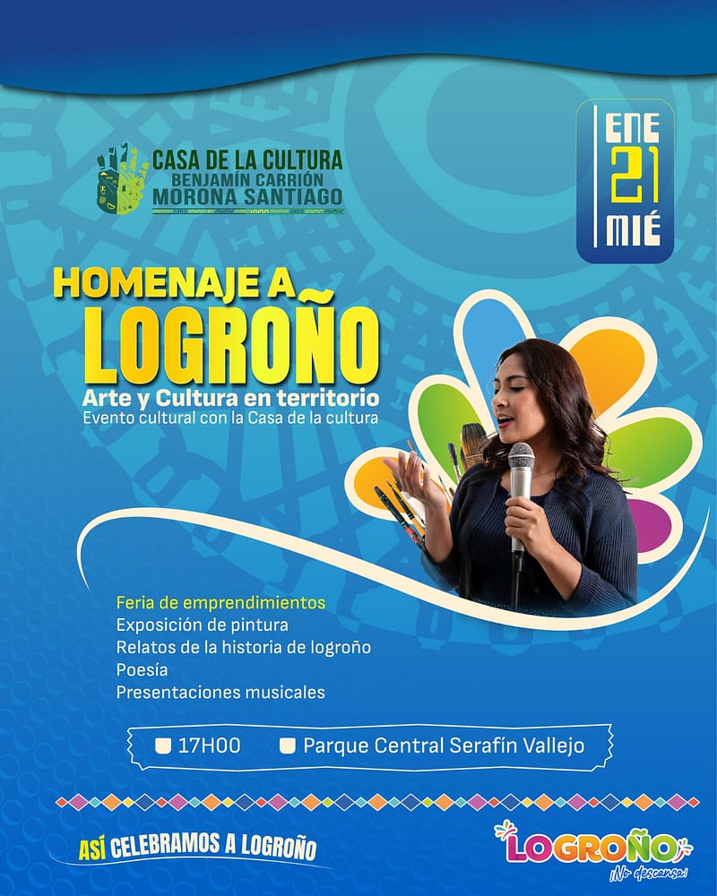 La Casa de la Cultura Ecuatoriana Benjamín Carrión – Núcleo de Morona Santiago invita a la ciudadanía a ser parte del evento cultural “Homenaje a Logroño – Arte y Cultura en Territorio”, una jornada dedicada a celebrar la identidad, la memoria y las expresiones artísticas del cantón Logroño.