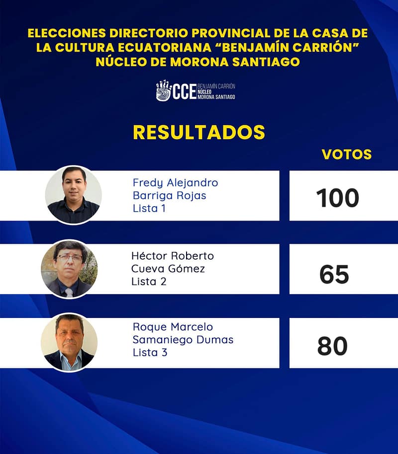 🗳️ Proceso Electoral del Directorio Provincial de la Casa de la Cultura “Benjamín Carrión” – Núcleo de Morona SantiagoResultados Electorales